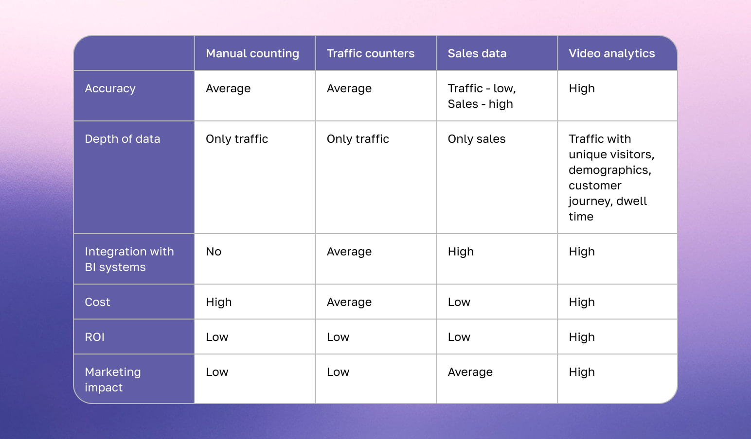 Video analytics is the newest and most advanced approach to offline retail analytics. It accurately counts unique visitors, analyzes audience demographics, and tracks in-store behavior: such as dwell time, movement maps, and interactions with products or screens.